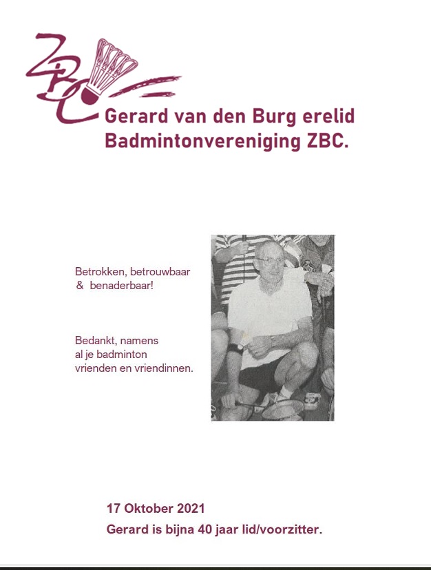 Op 17 oktober 2021 werd Gerard van de Burg tot erelid benoemd. Hij was op dit moment ook bijna 40 jaar lid van de club. Hij kreeg een oorkonde overhandigd en is als erelid nog altijd actief betrokken bij ZBC.
